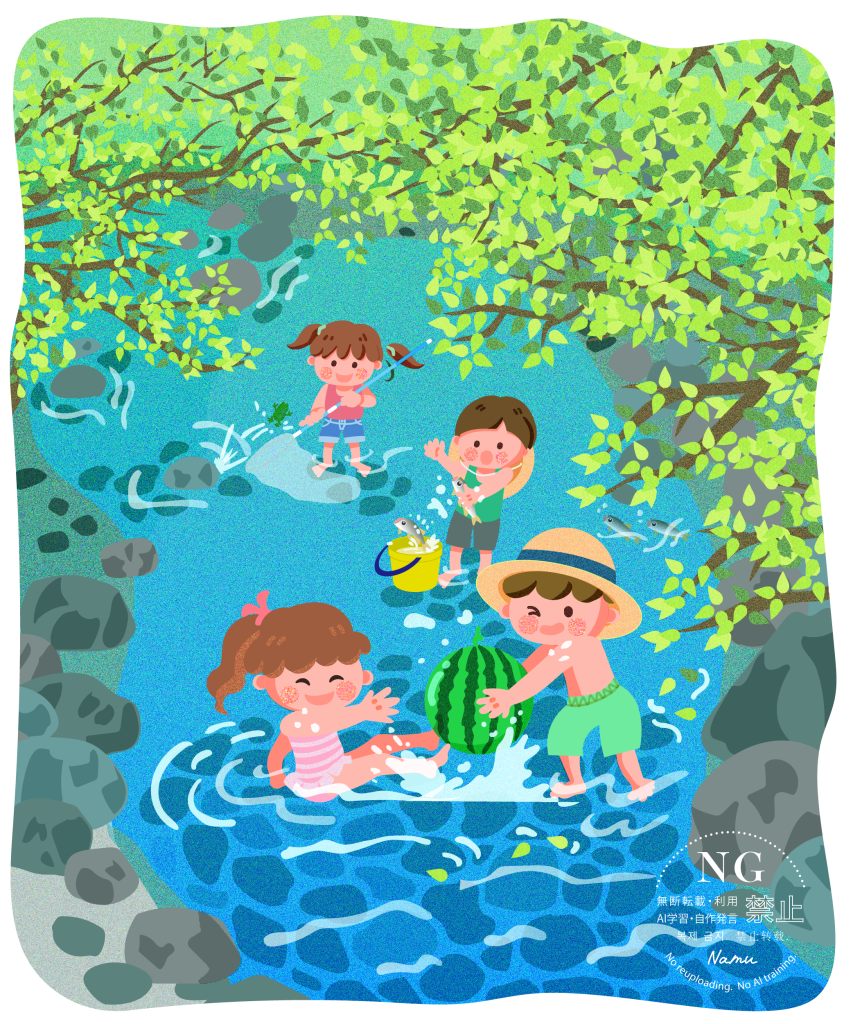 川に入ってスイカを冷やす、魚やカエルを捕まえる、