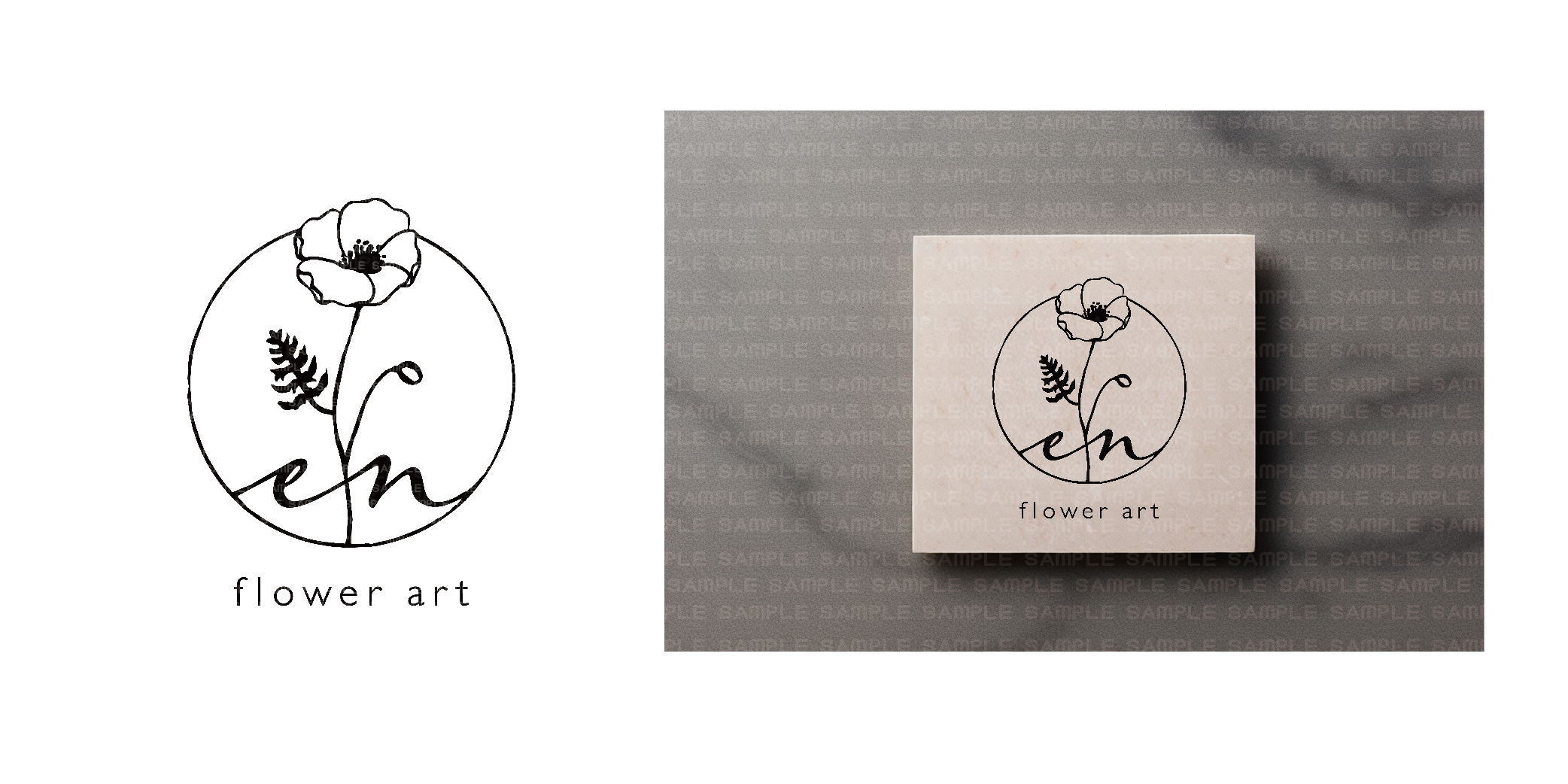手描きの味わいを残しつつ、シンプルモダンに描いた花に、”en”のカリグラフィーを加えて円でまとめました。